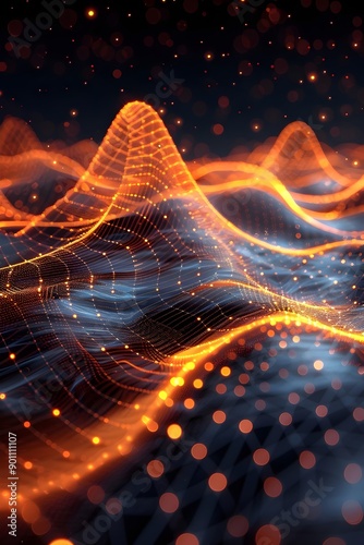 Mesmerizing Digital Waveforms: Illuminated Curves and Dots on a Dark Canvas, Abstract Representation of Technology and Data Flow