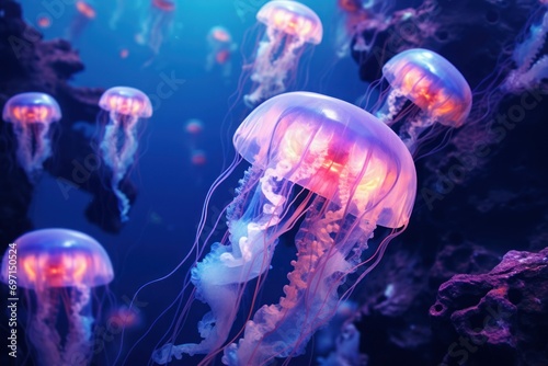 Mesmerizing Jellyfish glowing pink underwater color. Flower deep. Generate AI