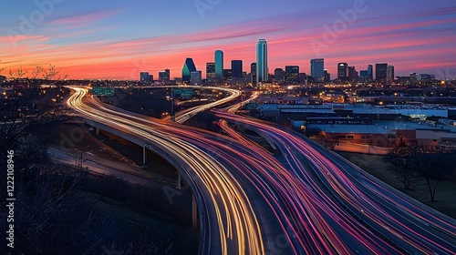 Mesmerizing light trails from passing vehicles weaving through the glowing skyscrapers and urban infrastructure of a bustling city skyline at dusk