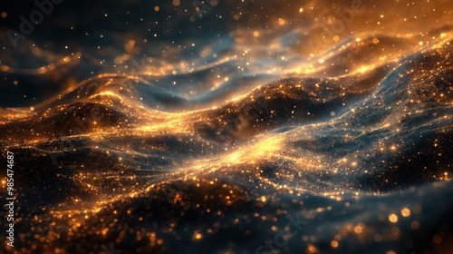 Mesmerizing view of glowing golden particles swirling over a dark background, resembling a glittering galaxy or shimmering waves of light. The effect is ethereal and magical.