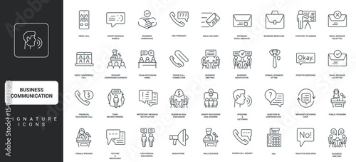 Messages of meeting, no and okay, question in speech bubbles thin black symbols vector illustration. Business communication, people communicate on conference, send email line icon set.