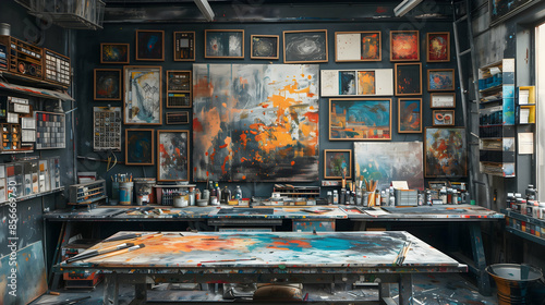 Messy Art Studio with Abstract Paintings - A cluttered art studio filled with abstract paintings, art supplies, and a large table covered in paint, showcasing the creative chaos of an artist's