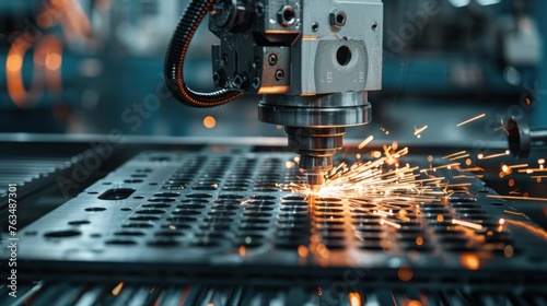 Metal laser cutting machine head with sparks in industrial background. AI generated image