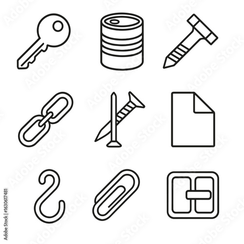 Metal Object Icons. Outline style icons of Common Metal Objects: metal key, tin can, metal bolt, steel chain, nail and screw,