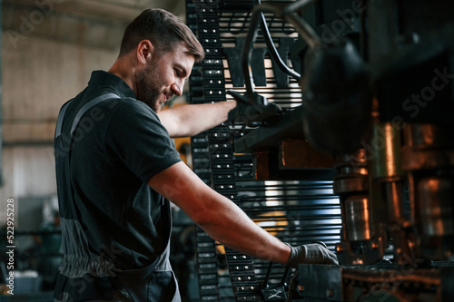 Metal processing device. Man in uniform is in workstation developing details of agriculture technique