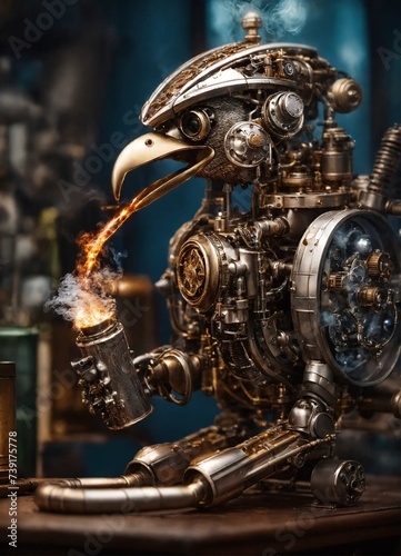 Metal robotic eagle drinking fire in detailed robotics workshop space
