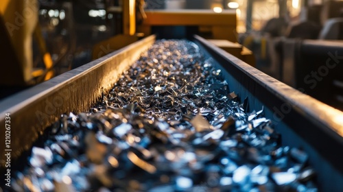 Metal scraps moving along a conveyor belt inside a factory highlight the intricate processes involved in industrial recycling and efficient waste management practices