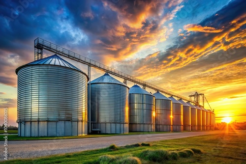 Metal structures for storing harvested crops in a sunset backlight wide-angle shot