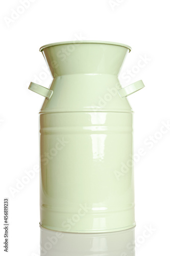Metal vase painted with light pistachio, mint color paint, isolated on a white background