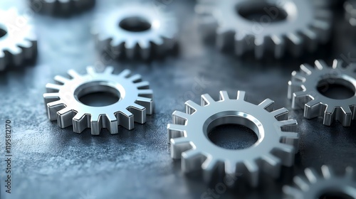 Metallic gears intermeshing on a textured surface, showcasing teamwork & industrial processes