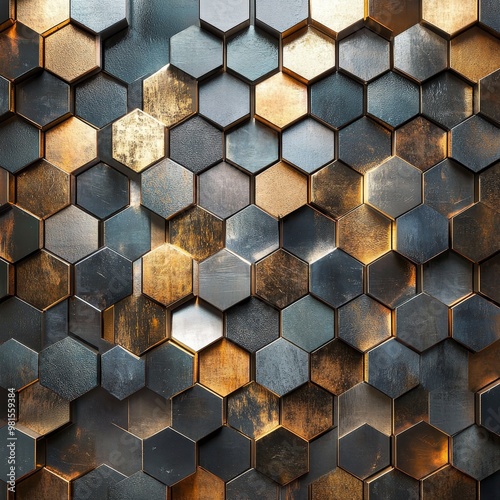 Metallic Hexagon Wall Pattern, Gold, Black, Texture