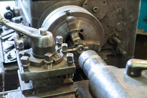 Metalwork equpment. Close-up of lathe and worker`s hand. Thread cutting on a stud.