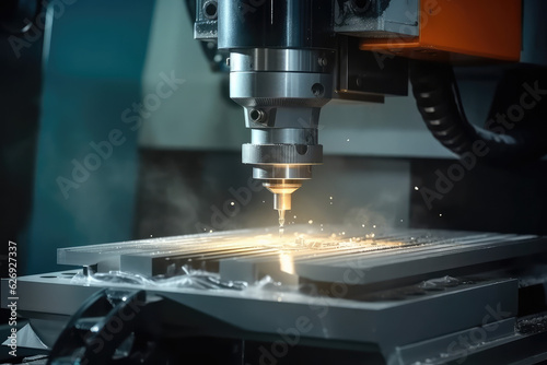 Metalworking CNC milling machine. Cutting metal modern processing technology. banner with copy space, generative AI