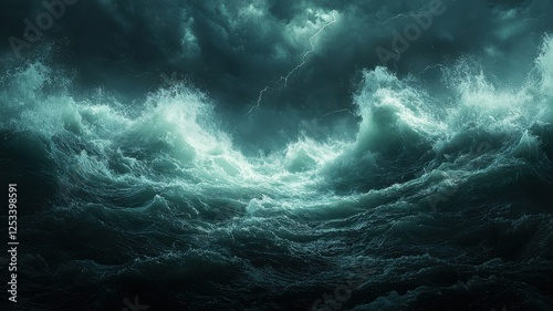 Meteorological phenomena concept. Dark turbulent ocean waves crashing under a stormy sky.
