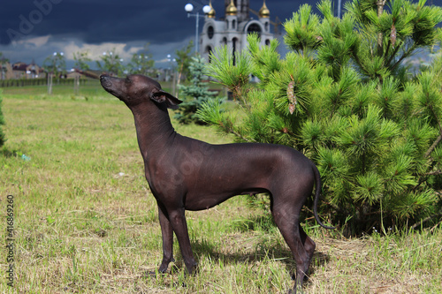 Mexican Naked Dog up close. Xoloitzcuintli against a background of green spruce