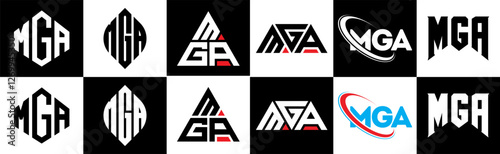 MGA letter logo design in six style. MGA polygon, circle, triangle, hexagon, flat and simple style with black and white color variation letter logo set in one artboard. MGA minimalist and classic logo