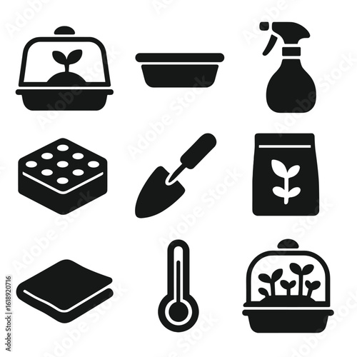 Microgreen Gardening Tools. Solid, filled icons set of indoor microgreen gardening tools: plastic dome lid,