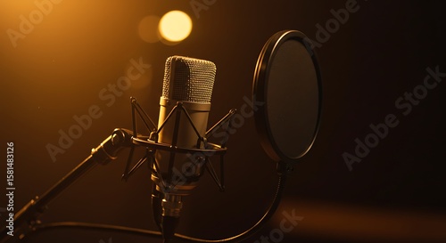 Microphone Captures Sound Studio Recording in Dark Ambience. A professional recording studio microphone
