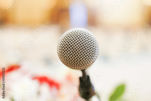 Microphone close up in meeting seminar room blurred background with bokeh