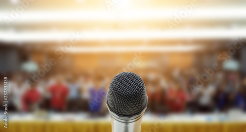 Microphone over the Abstract blurred photo of conference hall or seminar room with attendee background,Small Business training concept,Public speaking