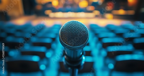 Microphone Positioned in an Empty Theater Ready for a Live Performance at Night