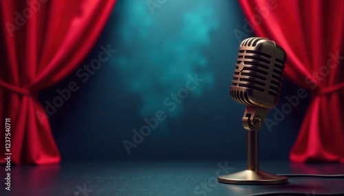 Microphone spotlight with red velvet drapes and blurred background, stage, spotlight