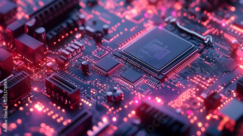 Microprocessor chipset central processor unit on the illumination circuit computer mainboard. Cyber and futuristic concept, hardware, AI, electronics and technology, with copy space