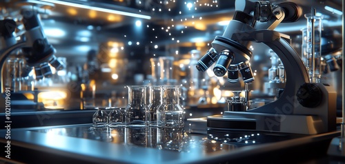 Microscope and glassware on a lab table, lit by blue and yellow lights.
