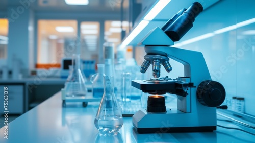 Microscope and research equipment on experiment bench in a biochemistry lab