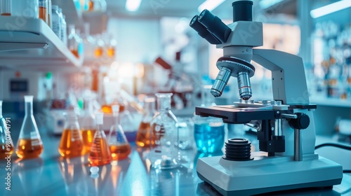 Microscope in a Laboratory with Beaker, Science Equipment, Research, Experiment, Microscopy