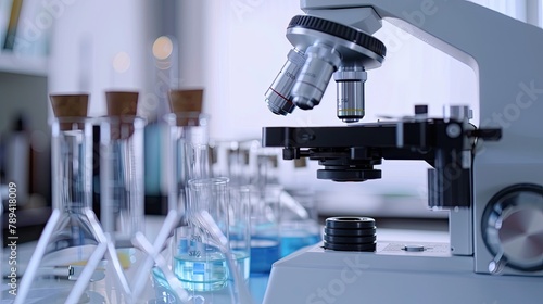 Microscope standing on workplace of modern scientist or clinician with group of flasks and other glassware
