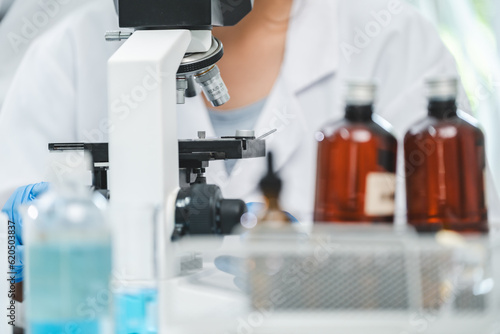microscope tool technology using in laboratory, scientific equipment for microbiology science research, medicals scientist analysing experiment in term of biology or biotechnology for medicine test