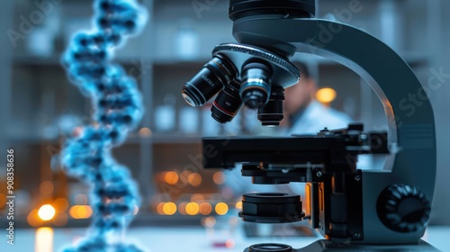 Microscope view of DNA sample, scientists in background, laboratory, front view, precision genetic study, cybernetic tone, Tetradic color scheme, copy space for text,