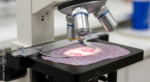 Microscope with animal tissue samples in veterinary lab, close-up, educational purpose