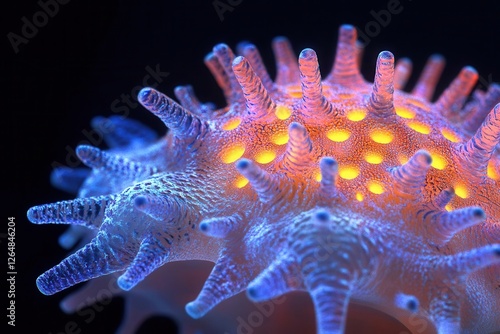 microscopic 3d visualization of a luminescent virus structure with detailed protein spikes in neon colors