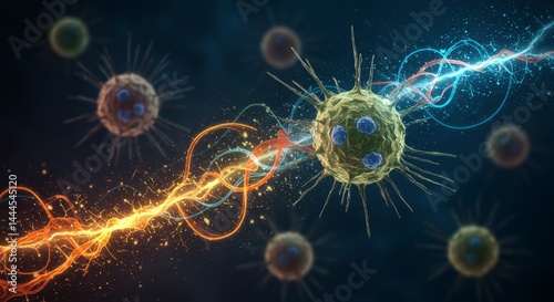 Microscopic view of a virus or bacteria cell being attacked by energy waves. Concept of antivirus, immune response, or medical treatment.