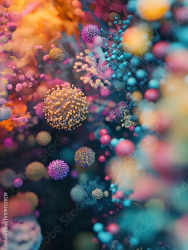Microscopic view of colorful virus cells, biological science, vivid colors