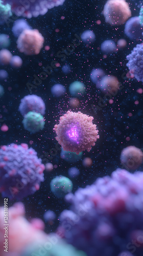Microscopic view of colorful virus particles in dark background, showcasing intricate details and vibrant colors
