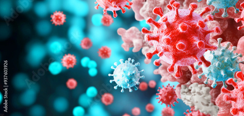 Microscopic View of Coronavirus Particles in a Blue Background Illustrating Viral Infection and Disease Spread