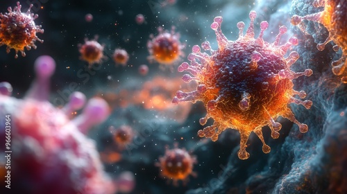 Microscopic view of floating viruses in a dark, cloudy environment, highlighting the texture and structure of viral elements.