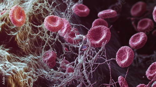 Microscopic view of human blood showcasing red blood cells circulating among leukocytes with intricate fiber structures in the background