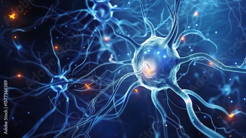 Microscopic view of nerve tissue showing neurons with long axons, dendrites, and a cell body, along with glial cells, highlighting their role in transmitting electrical signals and facilitating commun