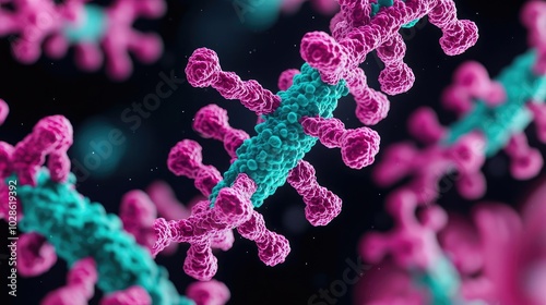 Microscopic view of vibrant virus structure, colorful isolated elements.