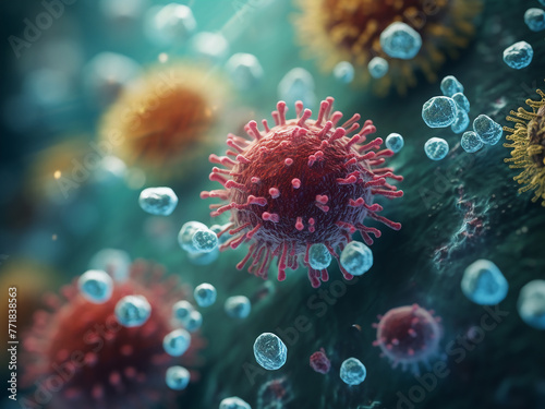 Microscopic view reveals bacteria and virus cells in scientific background.