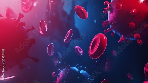 Microscopic View: Viruses and Blood Cells in a Dark, Neon-Lit Setting