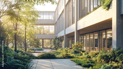 Mid-century modern office building, concrete structure, large windows, surrounded by greenery, 3D render