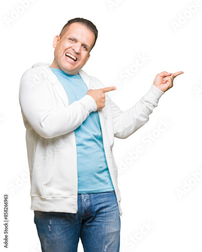 Middle age arab man wearing sweatshirt over isolated background amazed and smiling to the camera while presenting with hand and pointing with finger.