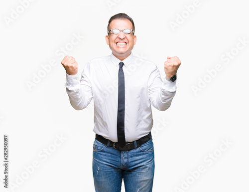 Middle age bussines arab man wearing glasses over isolated background celebrating surprised and amazed for success with arms raised and open eyes. Winner concept.