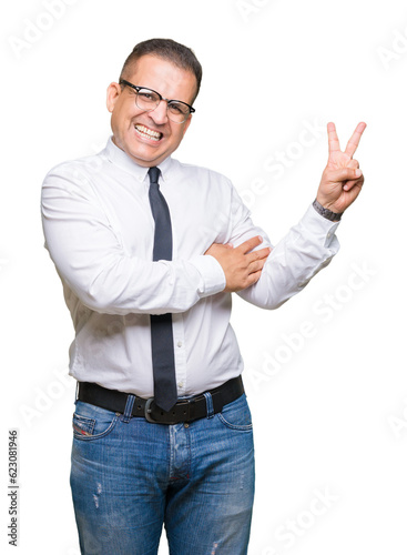 Middle age bussines arab man wearing glasses over isolated background smiling with happy face winking at the camera doing victory sign. Number two.