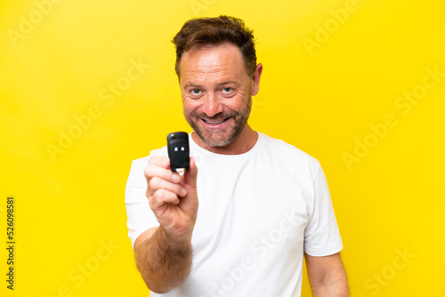 Middle age caucasian man holding car keys isolated on yellow background with happy expression